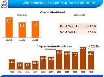 comparativo com abril do ano passado, quando foram vendidas 7,4 mil máquinas, o resultado foi inferior em 17,7%. Os dados do quadrimestre apontaram redução de 20,3% ao se comparar as 21 mil de 2014 com as 26,3 mil de 2013.
