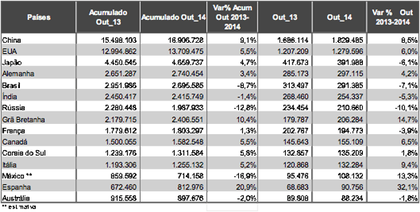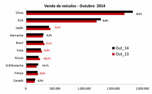 A China mantém a liderança com quase 17 milhões de veículos vendidos de janeiro a outubro de 2014, o que representa crescimento de 9,1% no acumulado e 8,5% no mês de outubro se comparado ao mesmo período de 2013. Os EUA seguem em 2º lugar com alta nas vendas de 6% no penúltimo mês do ano. O Japão mantém a 3ª colocação com queda significativa de 6,1% no mês, porém ainda com resultado positivo no acumulado dos 10 meses de 4,7%.
