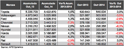 A JATO Dynamics do Brasil, líder em fornecimento de informações automotivas, divulgou dados mensal de veículos vendidos mundialmente em outubro de 2014.