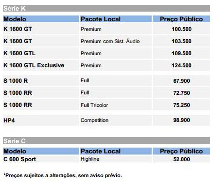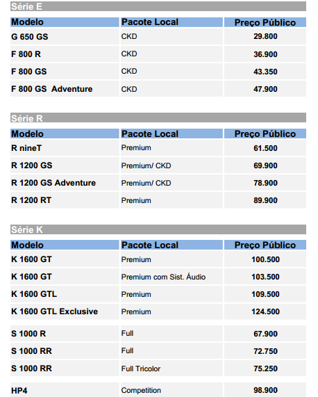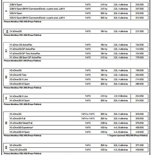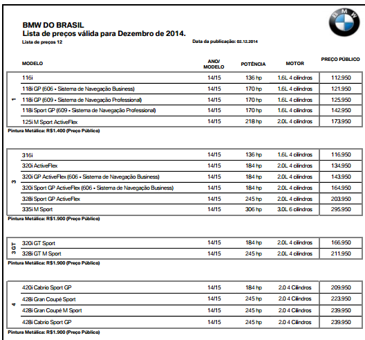 TABELA DE PREÇOS BMW GROUP BRASIL