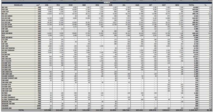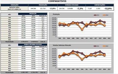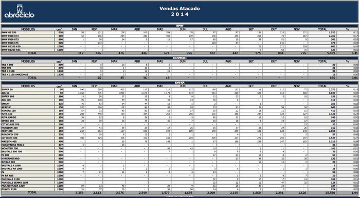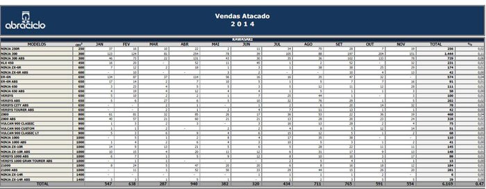 Os números do acumulado do ano das vendas no atacado (da montadora para as concessionárias) fecharam 11,3% abaixo do registrado em 2013. Foram 1.483.307 (2013) contra 1.316.391 (2014). Na comparação mensal, os resultados foram 7,2% menor, gerando um volume de 129.156 motocicletas comercializadas, em outubro, contra 119.808, em novembro.