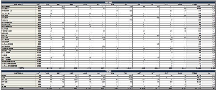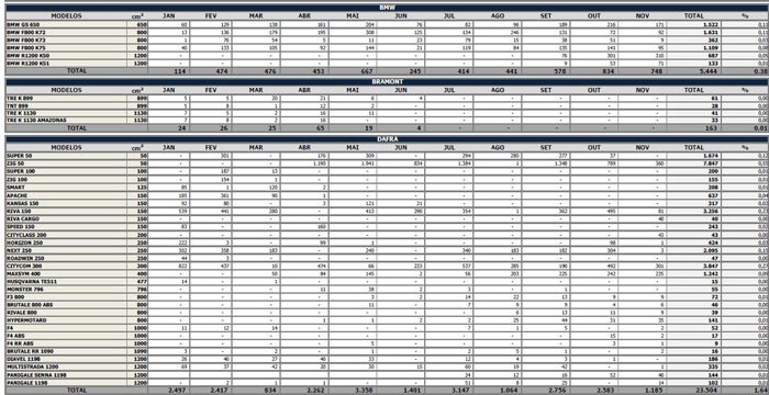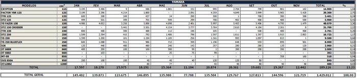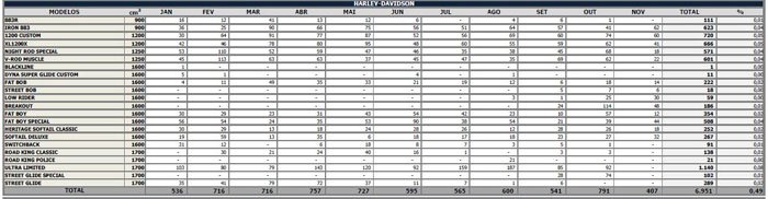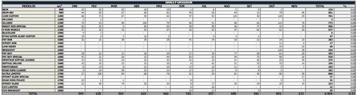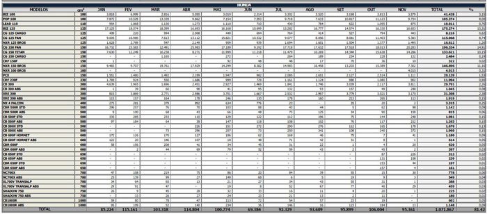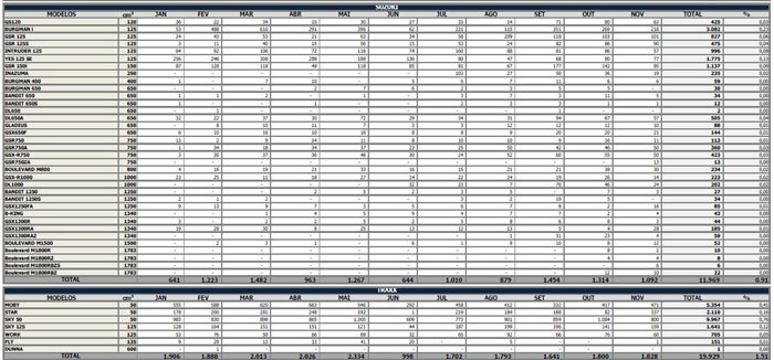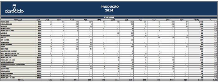 Nos primeiros 11 meses do presente ano foram comercializadas para as concessionárias 49.050 motocicletas, contra 45.229, em 2013, um incremento de 8,4%. No mesmo período, foram produzidas 51.122 unidades, em 2014, frente a 45.778, no ano passado, o que corresponde a uma alta de 11,7%.